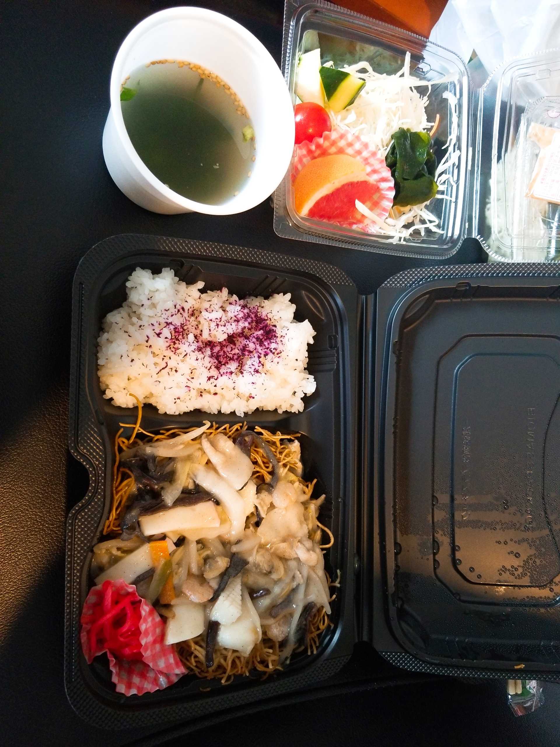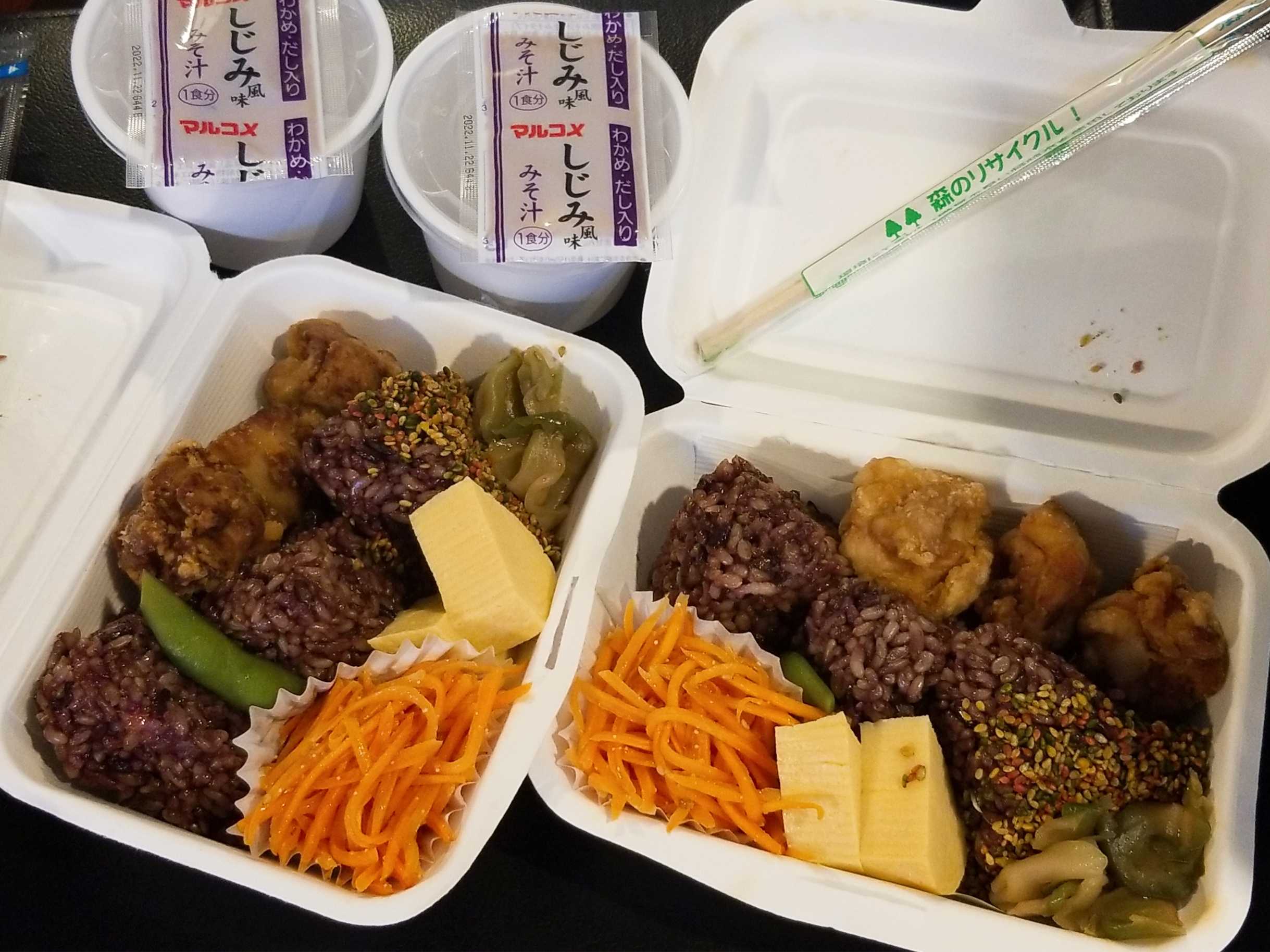 お弁当にお茶でなく、水しか付かないから、粉茶とかインスタントコーヒーとか、粉末飲料持参をおすすめする。