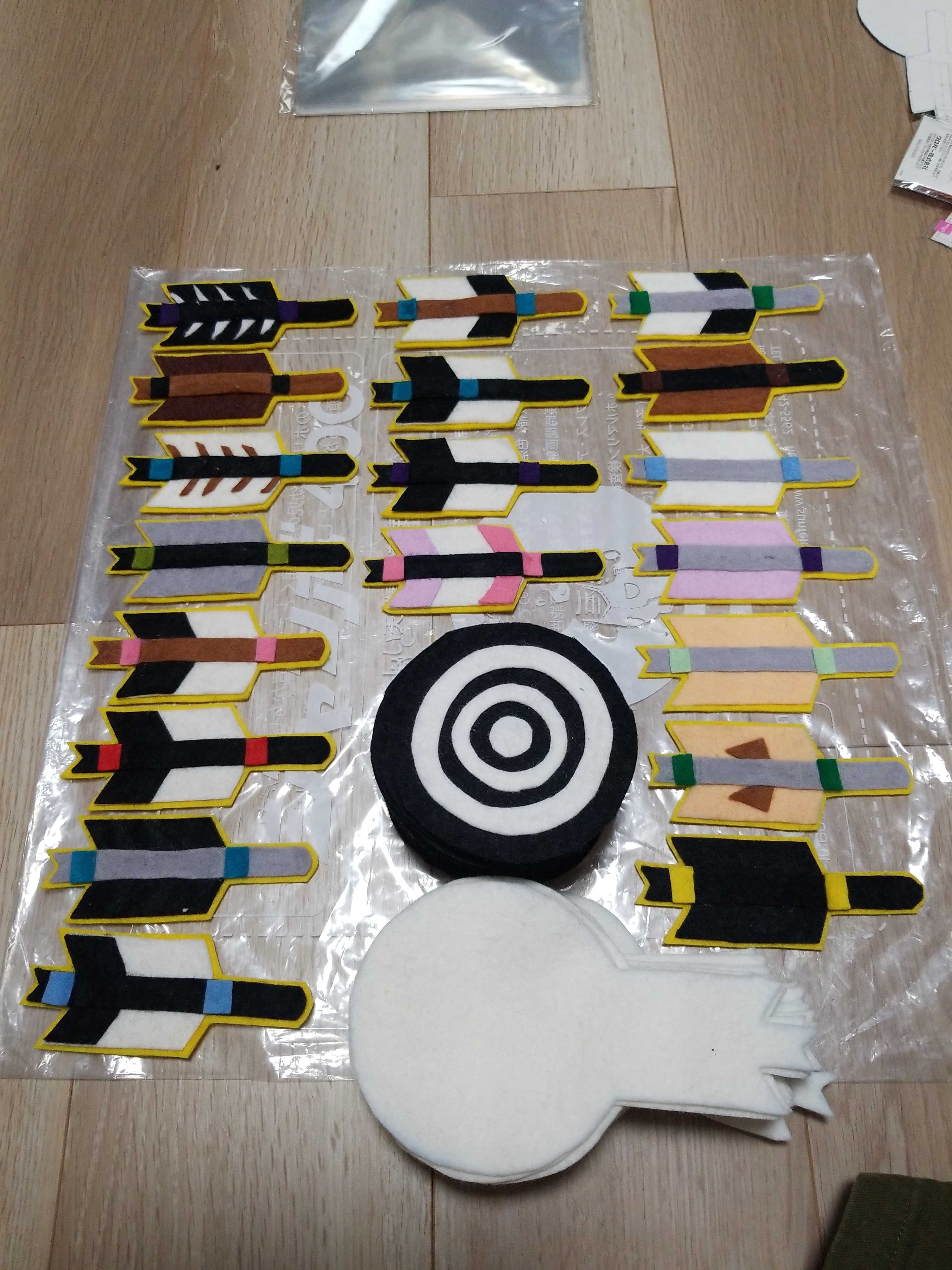 パーツをフェルト用ボンドで貼り付けて、的柄と裏の白布同士をブランケットステッチで合わせ縫いするだけだから。