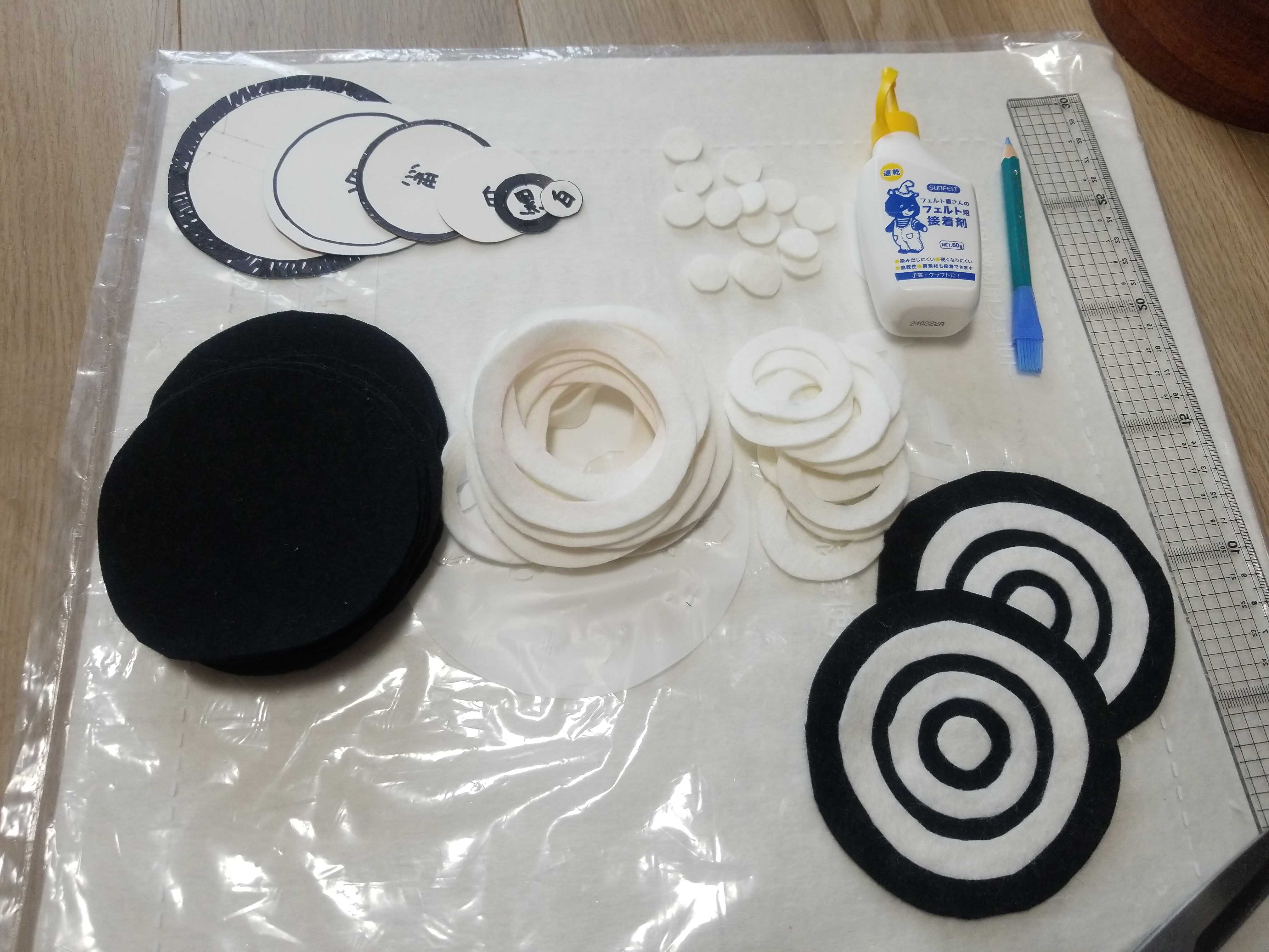 黒丸フェルトに玉ねぎみたいな白いフェルトの輪をフェルト用ボンドで貼り付けていくんだよ。