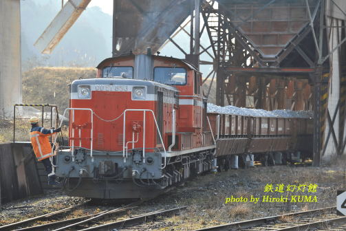 今日3月7日は、消防記念日、東京消防庁開庁記念日、警察制度改正記念日、花粉症記念日だそうです。花粉症のわたしにとっては、あまりうれしくない記念日です。単機で重安駅に着いたDD51はすぐに石灰石の積み込み作業を行います。巨大なホッパーの下に空の貨車を押し込み、積車になると1輌ずつずらして次の空車に積載するという作業の繰り返しです。すべての貨車に石灰石を積み終えると、機関車は一旦貨車から離れ、単機で反対側へと移動します。そして貨車全体をホッパーの下から引き出して重安駅のホームに移し、そこで出発までしばしの間、休憩します。重安駅には巨大なホッパーがありますが、石灰石の積み込み作業では誘導員が一人ついているだけで、あとはDD51の運転士が一人いる以外、ほとんど人影を見ません。ホッパーから大きな音を立てて石灰石が落ちている割に、作業は淡々と進められているという印象です。本日の「思い出の1枚」は、貨車を少しずつずらしながら貨車に石灰石を積み込んでいるシーンです。