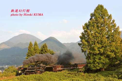 今日11月12日は、洋服記念日(全日本洋服協同組合連合会、1972年)だそうです。午前中は強い風のため、駆け足で雲が流れ去っていたのですが、午後になると天候は安定し、雲の数も減って快晴に近い状態となりました。山登りをしたため、津和野行「やまぐち号」の撮影は1回だけ。いつもとは違ってのんびりと撤収し、早めにお昼をとって津和野へとC57を追いかけます。さて、返しの「やまぐち号」をどこで撮るかと思案したのですが、津和野へ来る途中のロケハンでお気に入りのポイントを見つけましたので、午後の「やまぐち号」のメインはそちらとし、その前にお手軽に撮影できる鷲原で撮影して追いかけることにしました。晩秋ともなれば真茶色に変わる鷲原のランドマーク、メタセコイアの大木も、枝の端が少し変色し始めたくらいで、お目当ての色になるには、いま少し時間がかかりそうです。さて、定刻。津和野の盆地に発車の汽笛が鳴り響き、鷲原にもそのこだまが届いてきました。列車が通過するまでにはあと数分かかります。構図と露出を確認し、雲の流れもチェックします。OK。そして数分後、勇壮なドラフト音が刻一刻と大きくなってきます。何度聞いても良い音だ。そしてついにメタセコイアの木の陰からC57が姿を現しました。真っ黒の煙が上がっています。右の大木、奥の円錐形の青野山、それぞれのバランスをはかりながらシャッターを切りました。はい、OK!