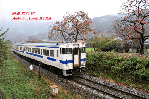今日11月15日は、きものの日(全日本きもの振興会)、こんぶの日(日本昆布協会)、かまぼこの日(全国蒲鉾水産加工工業協同組合連合会)、生コンクリートの日だそうです。日田彦山線の北半分は初めての訪問でしたので、ロケーションがよく分かりません。そうしたときに役立つのは、何といっても撮影地ガイド『お立ち台通信』です(あら、よいしょっ、と! 笑)。これを参考に、日田彦山線で紹介されているポイントをめざしました。なるほど、ここはこうなっていたのか。晴れた日に編成写真を撮るのにはピッタリのポイントだね、と現場を見て感心し、とりあえずここで撮影していこうか、などと思ったのですが、まわりを見回すと、少し離れたところに、たわわに実をつけた柿の木が並んで立っているのを見つけました。いかにも秋らしい風情が漂っていますので、オーソドックスな編成写真は次の機会とし、柿の木と組み合わせたカットを選択しました。