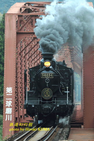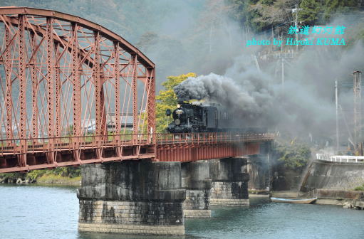 午前の下り列車を5回撮影して人吉に着きました。人吉では、なぜかラーメンや餃子といった中華料理が人気のようで、前回、行列ができていて入れなかった餃子屋さんでお昼をすませました。そのあと、人吉駅構内の機関庫で午後の仕業に備えて休憩中のハチロクを撮影したあと、撮影ポイントへと移動しました。午後一発目の場所としたのは第二球磨川橋梁です。門デフを真正面から狙う、いわば掟破りの構図となりますが、バリエーションカットの1つとしてぜひとも欲しいと思い、橋のたもとに陣取りました。上り列車は球磨川に沿って下りますので、基本的には下り勾配の連続で、煙は期待できないと思っていたのですが、思いもよらず結構なボリュームの煙をあげてくれ、その煙を一人占めできたという僥倖に、思わず快哉を叫んでしまいました。