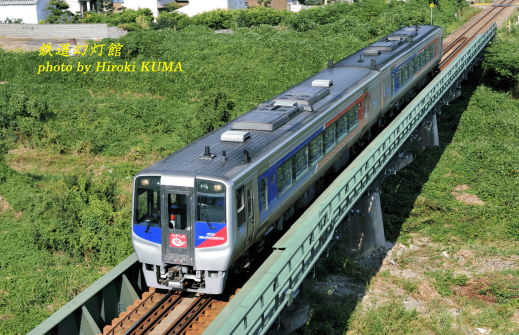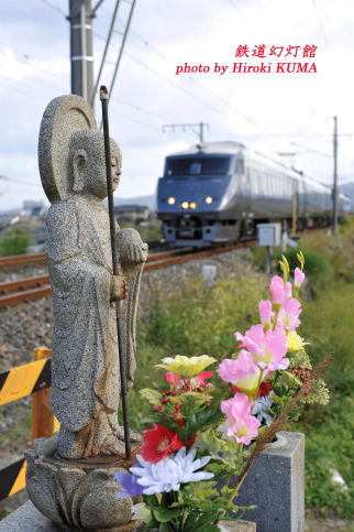 今日11月18日は、土木の日(日本工学会、土木学会、1987年)、著作権の日だそうです。夕暮れ迫る九州自動車道を一路南下し、新八代駅前で一泊した翌朝は、前日の雨がうそのような好天でした。本日のメインイベントはハチロクが牽く「SL人吉号」の撮影ですが、老兵ハチロクと再会する前に一仕事、いや、二仕事ほど済ませておかなければならないことがありました。その1つが、九州新幹線の全通を1年半後に控えている特急「リレーつばめ」の雄姿を記録することです。現在、博多と新八代間を結んでいる「リレーつばめ」ですが、平成2011年3月の新幹線全通により、当然姿を消してしまいます。鹿児島本線から分岐し、新八代駅の新幹線ホームへと駆け上がっていく姿も要記録ものですが、鹿児島本線上を走っている787系も今のうちに撮っておかなければなりません。東海道本線や山陽本線を例に挙げるまでもなく、新幹線が開業すれば、在来線の特急は見事なまでに姿を消してしまうからです。そんなことを考えながら、朝食前に新八代近辺をロケハンしてまわりました。ちょうど線路際に石仏が立っていましたので、それと組み合わせて「リレーつばめ」を撮影しました。在来線ならでは、の風情ある景色が記録できました。