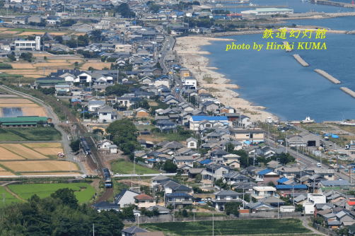 今日11月1日は、山手線が神田~上野間の高架線開通で環状運転開始(1925年)、灯台記念日(海上保安庁、1949年)、犬の日(ペットフード工業会など、1987年)、自衛隊記念日(防衛庁)、紅茶の日(日本紅茶協会)、全国家具の日、本格焼酎の日、玄米茶の日、計量記念日(通産省)、すしの日(全国寿司商環境衛生同業組合連合会、1961年)だそうです。香川県と徳島県の県境には大坂峠という九十九折りの道があります。今は高速や海岸沿いの国道が整備されているため、それほど苦労することなく両県を行き来できますが、瀬戸内から吉野川方面へ行くショートカットルートにあたるため、今も通行する車が結構あるようです。この峠からは播磨灘を入れて讃岐平野が大俯瞰できます。小さいころ、わたしは一時期、この峠の隣町に住んでいました。しかし、車に乗るなどしなければ越えることの難しい急峻ですので、子どもだったわたしには当然、このような場所があることなど、知るすべもありませんでした。今回初めて大坂峠に足を運び、眼下に広がる讃岐平野と青い播磨灘を眺めて感動しました。生まれて初めて目にする景色ですが、地図で概括的に分かっていた位置関係が、具体的に理解できました。これまでにも折にふれ、いろいろな場所を俯瞰してきましたが、自分が住んだことのある場所は、思い入れもあって一味違います。さて、本日の「思い出の1枚」。あまりにも大俯瞰すぎて、どこに列車が写っているのか、分かりにくいと思います。画面の左下隅に小さな森がありますが、そこの少し上に2輌編成の列車が走っています。見えますでしょうか? 徳島へ向かう特急「うずしお」です。このあと、この列車も大坂峠越えをして徳島県に入ります。もちろん、鉄道ですから、道路のような折り返しはないのですが、急勾配を上ったあと、長いトンネルで徳島へと抜けていきます。