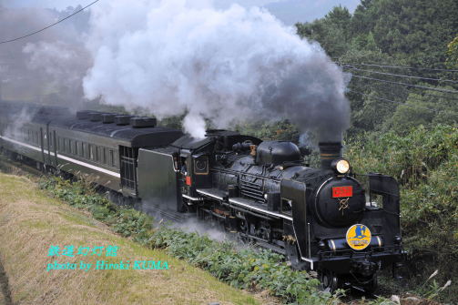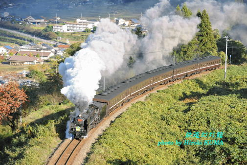 今日11月13日は、うるしの日(香川県漆器工業協同組合など)だそうです。返しの「やまぐち号」は追っかけの成果があがり、予定していたカットを順調に押さえることができました。このあと、北九州まで移動するため、どちらにしても南下していかなければなりません。紅葉見物で混みあっているだろうと思った長門峡周辺も、すんなりとパスできましたので、おまけの気持ちで篠目へ寄ることにしました。前回の山口訪問では、最後の締めとなる篠直が、期街したほど煙が上がりませんでしたので、今回は奥まで入らずに駅発車直後を狙うことにしました。あまり期待もせず待っていると、篠目を発車した「やまぐち号」は篠直へと続く坂道を全力でダッシュしてきます。大太鼓をたたくようなドラフト音も勇壮です。これはおまけ、などと高をくくっている場合ではありません。ワクワクしながらシャッターを切りました。あらためて「やまぐち号」の実力を見せつけられた気がします。おそるべし、やまぐち号!