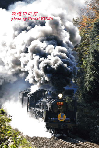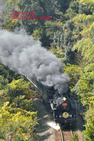 今日11月11日は、日本鉄道会社設立(1881年)、世界平和記念日(第一次世界大戦休戦)、ジュエリーデー(日本ジュエリー協会)、電池の日(日本乾電池工業会、1987年)、ピーナッツの日(全国落花生協会、1985年)、チーズの日(チーズ普及協会など)、ライターの日、西陣の日、恋人達の日、折り紙の日、磁気の日、サッカーの日だそうです。大山路から始まり、長門峡、地福、徳佐へと続く移動撮影は、これまでにも幾度となく繰り返してきましたので、今回の山口訪問では久しぶりに山登りをしてみようと思っていました。数年前、フィルムカメラを使っていたころには、山口線の俯瞰ポイントにも一とおり足を運んだのですが、その後、ご無沙汰していましたので、果たして行き方を覚えているだろうか、と思ったのですが、俯瞰ポイントへと続く道を目にすると、自然と足が動きました。暦はもう11月というのに、この日は気温が高く、久々の登坂では汗をかいてしまいました。以前は必ずいたご同業も、この日は線路際のカーブで望遠レンズを構える方以外誰もおらず、わたし一人だけです。はらはらと舞い散る色づいた木の葉に混じり、時折、ドングリが木の幹や地面で弾けてカーンという乾いた音を立てますが、それも一瞬のこと。静かな時間が流れます。数年のときの流れにより、木の枝が繁茂して、以前より見通しが悪くなったカーブの先に目を凝らし、列車の通過を待ちます。しばらくしてC57がトンネルに突入する汽笛が響いてきました。ドラフト音も刻一刻と強くなってきます。すでに何度も経験した、この瞬間の気分の高揚と緊張感は格別です。「おお! 今日は赤ナンバーに、集煙装置なしだ!」。体内のアドレナリンが一気に増大しました。