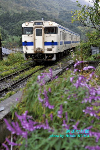 今日11月14日は、パチンコの日(全国遊戯業協同組合連合会、1979年)だそうです。昨日の好天が一転し、翌日は朝から雨。週間天気予報どおりです。もちろん、そのことは織り込み済みですから、次の日の肥薩線撮影に備えて移動がてら、南への道をたどり、日田彦山線で撮影することにしました。同線では、筑前岩屋~大行司間にあるメガネ橋が有名です。光線的には午後が適していますので、天気が好転することを祈りながら、午前中は彦山までの区間をロケハンしていきました。日田彦山線は、小倉と日田をつないでいますが、時刻表上では全区間通して運転される列車はありません。基本的には田川後藤寺で乗り換えるようになっています。英彦山の急峻を越えるのが理由の1つなのでしょうか。そんなことを思いながら移動していると、踏切の近くにねじり草のような紫色の花が咲いているのを見つけました。もうすぐ列車が通過しますので、これと組み合わせて撮ることにしました。しばらくして2輌編成のキハ47が山から下りてきました。カメラや身体が濡れて大変ですが、雨の日のしっとり感も、たまには良いものです。