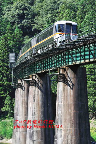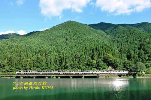本日の「思い出の1枚」は、昨日と同じ飛水峡で撮影したもののバリエーションカットであります。飛水峡といえばこの場所、この角度で撮ったものが有名でございます。雑誌の表紙になったこともあり、いわば絵はがき的お手本写真と申せましょう。急流の水が長年の歳月をかけて岩を削り取り、ゴツゴツとした岩肌が折り重なる屏風のような景色を生みだしました。天下の名勝でございます。その景色の中をキハ47と40のペアがゆっくりと駆け抜けます。鉄橋の上にバランスよく乗った瞬間がシャッターチャンスであります。うん、何とか押さえることができたかな。撮影地:高山本線上麻生~白川口今日8月5日は、タクシーの日(東京乗用旅客自動車組合、1984年)だそうです。