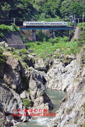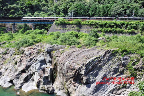 太多線から高山本線へとポイントを移します。高山本線は非電化、かつ風光明美な路線で、わたくしのお気に入り線区の1つでございます。川に沿って撮影ポイントが点在しているという点では、四国の土讃線、九州の久大本線などに雰囲気が似ております。名撮影地の1つ、飛水峡へまいりました。水流で岩肌が削られたさまは、中央本線の寝覚ノ床にも似かよったところがあり、自然美を感じます。川に沿ったカーブをキハ85系ワイドビューひだが駆け抜けてまいります。おお、ビュリフォ~でございます。撮影地:高山本線上麻生~白川口今日8月4日は、橋の日、箸の日(わりばし組合、1975年)だそうです。