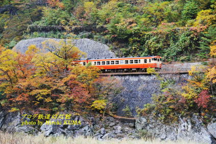 高山に一泊し、翌日は大阪方向へ移動しながら高山本線を撮影していったのでありますが、紅葉の季節とあって、沿線のいたるところでおテツの姿を見かけました。高山本線で今、旬といえば、一般国鉄色風に塗り直されたキハ40、48のトリオでございます。「ワイドビューひだ」狙いで、あるポイントへ行ったときのこと。特急がやってくるまでには、しばらく時間があると思ったわたくしは、どのアングルで撮ろうかと、ああでもない、こうでもないとウロウロしておりました。ほぼこのあたりかな、と思った瞬間、雪よけシェルターの中から赤い気動車が飛び出してきたのでございます。ん? あらぁ~!心の準備が整っていないままにシャッターを連写いたしましたが、通過後のモニターチェックでは、う~む、リベンジが必要かも。撮影地:高山本線飛騨小坂~渚今日11月21日は、関西鉄道会社で客車の外側に塗装を施して等級を区別しはじめた日(1896年)、一休宗純(87歳)・近松門左衛門(72歳)・トルストイ(82歳)没だそうです。