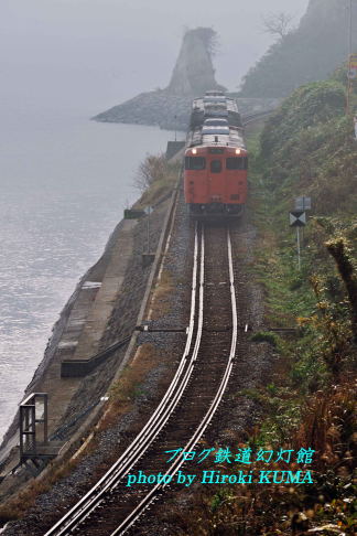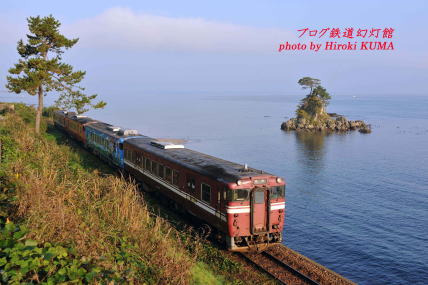 越美北線から小松へ移動し、九谷焼を愛で、その夜は高岡に宿を取りました。高岡をベースにすると北陸本線だけでなく、氷見線、城端線、万葉線などを効率よく撮影して回ることができるからであります。翌朝、目を覚まして驚きました。前夜の天気予報では「晴れ」と報じられていたのでありますが、町は深い霧の中に沈んでいたのでございます。え~、約束が違うやん。しかし、「霧の朝は晴れる」と言います。一刻も早く雲散霧消し、輝かしい光線のもとで撮影をしたいと念じながらホテルをあとにしました。向かった先は氷見線の雨晴海岸。海岸に生えた一本松と、海の中に残る小島に育った松が、さながら夫婦松の様相を呈し、日本情緒漂う雰囲気で、わたくしのお気に入りの場所の1つでございます。海辺に近づくにつれて霧も晴れ、朝特有の斜光線を浴びて、深い陰影に刻まれた海辺の景色が広がっておりました。朝の通勤時間帯ということもあり、日中ならば2輌編成となる列車が4輌でやってきたのは驚きでありました。しかも、高岡カラーの間に忍者はっとりくんラッピング車とタラコ色がサンドイッチされ、このあたりで稼働しているキハが勢ぞろいとなっているのは、ラッキーでございました。撮影地:氷見線雨晴~越中国分今日11月13日は、うるしの日(香川県漆器工業協同組合など)だそうです。