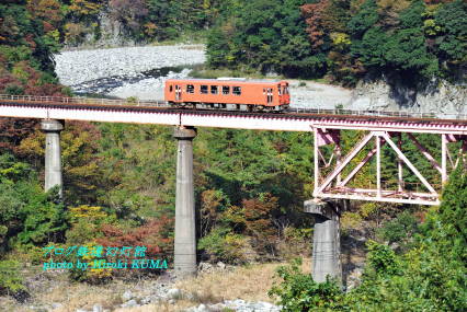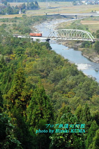 ローピン・パーイチの「日本海」を撮影後、北陸本線から越美北線へ転進いたしました。越美北線は久しぶりでございますが、行ってみて驚きましたね。キハ120がタラコ色になっていたのでございます。越美北線のキハ120といえば、白地に緑の落ちついたカラーリングで、あまたあるキハ120の塗装の中でも、個人的にはかなり上の方に位置していただけに、ちょっぴり残念でございます。でも、翌日、高岡で出会った福井のファンにお聞きしたところ、このタラコ色も、いつまで続くか分からないとのこと。車輛のカラーリングはともかく、長大な鉄橋を渡るキハ120を絶景の中で捉えることができただけでもヨシといたしましょう。撮影地:越美北線柿ヶ島~勝原今日11月11日は、日本鉄道会社設立(1881年)、世界平和記念日(第一次世界大戦休戦)、ジュエリーデー(日本ジュエリー協会)、電池の日(日本乾電池工業会、1987年)、ピーナッツの日(全国落花生協会、1985年)、チーズの日(チーズ普及協会など)、ライターの日、西陣の日、恋人達の日、折り紙の日、磁気の日、サッカーの日、ポッキーの日だそうです。