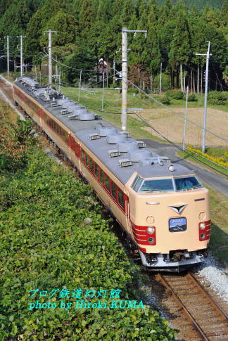 先週末は、久しぶりに電化区間の山陰本線を攻めてきました。新型287系の投入により国鉄色の183系が激減しており、今や風前の灯となっているからでございます。183系といえば、福知山線の「北近畿」改め「こうのとり」は、それなりに撮影したのでありますが、それに比べると山陰本線、特に京都寄り区間は少し手薄でございます。新たなポイントが探せないか、ロケハンを兼ねての撮影行となりました。すでに特急列車の運用の大勢は287系にシフトされており、ごく限られた列車に183系を見るという寂しい状況になっております。「本日の思い出の1枚」は、天空の橋とも言える高~い鉄橋を渡る287系特急「きのさき・まいづる」であります。手前のイチョウの色づきはまだまだですが、あと2週間もすれば美しい黄葉となるはず。心密かに再訪を期したのでございます。撮影地:山陰本線胡麻~下山今日11月4日は、ユネスコ憲章記念日だそうです。