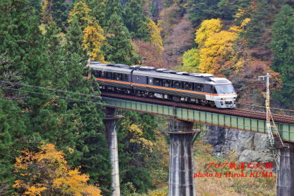 高山本線と言えば、清流に架かった鉄橋を渡る列車がウリの1つでございます。国道を走っていますと、眼下に鉄橋が見えました。お、ここ、良いやん。桁の長さから、特急だと編成が切れてしまいます。残念ながら、普通もしばらくやってきません。でも、バックの黄葉と組み合わせて、特急の先頭部を中心に切り取るのなら、それもアリかな、とわたくしは思ったのでございます。空中回廊のような高い橋げたの鉄橋を、轟音を立てながら「ワイドビューひだ」が渡ってまいります。周囲の木々の黄葉は、このときが盛り。錦秋の1カットとなりました。撮影地:高山本線飛騨小坂~渚今日11月22日は、ボタンの日(東京ボタン服飾手芸卸協同組合など)、いい夫婦の日だそうです。