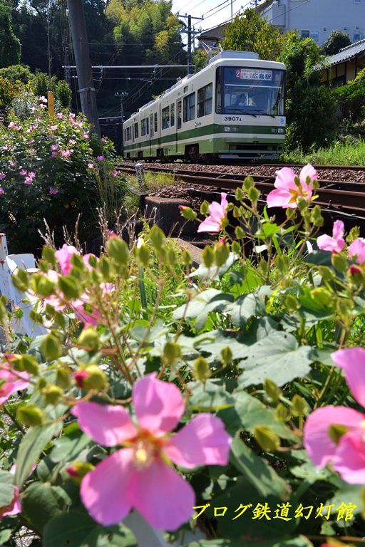 広島電鉄で数少ないトンネルがあるということで、廿日市市役所前駅で下車し、目的のトンネル近くまで歩いていきました。 まずはトンネル飛び出しのアングルを押さえ、そのあと、まわりを見回すとピンクのフヨウの花が咲いているのが目に入りました。季節ネタです。良いではありませんか。ワイドレンズで花を大きく取り入れ、その向こうを連接車が通り過ぎるアングルにしましょう。 わたくしが好きなやきものの一つ、石川県の九谷焼で人間国宝に認定されている吉田美統(みのり)さんが釉裏金彩の技法でフヨウの花をモチーフに多くの作品作りをしていますが、実物はこんな花だったのだ、と改めて見やりながら連接車の到来を待ちました。 撮影地:広島電鉄宮内~廿日市市役所前 今日10月25日は、世界パスタデー、民間航空記念日、産業観光の日、リクエストの日、島原の乱の日だそうです。