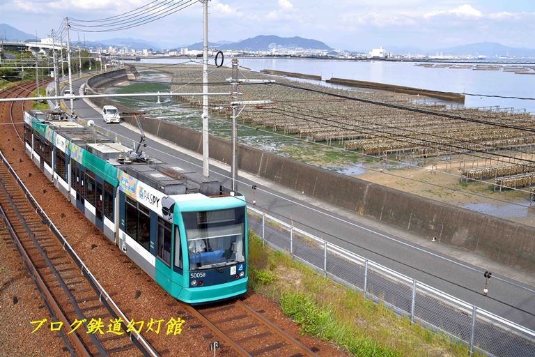 牡蠣の養殖棚と広電連接車広島の名産といえば、牡蠣もその一つ。花ネタの次はご当地ネタということで、海辺の停留所へやってきました。線路のすぐそばには瀬戸の海が広がっており、そこで牡蠣が養殖されています。普段は当然水の中に隠れている牡蠣棚ですが、この日はちょうど大潮の時期。干潮の時間帯なら、もしかすると養殖棚がすべて姿を現しているかも。 はい、予想どおりでした。ぶら下げられた牡蠣が完全に見えています。この場所へは以前も来たことがあるのですが、海底の砂地まできれいに見えているのは初めてです。これなら牡蠣の養殖場ということがよく分かります。あと数時間たてば再び水の中に戻るのですが、こんな光景を見たら、今夜は絶対牡蠣を食べなくては。広島焼きのお好みと牡蠣の蒸し焼きをビールで流し込む。想像しただけで食欲がわいてきました。 撮影地:広島電鉄地御前~阿品東 今日10月27日は、テディベアズ・デー、文字・活字文化の日、読書の日、世界新記録の日、日刊ゲンダイ創刊で駅売り夕刊のブーム到来(1975年)、浅草・凌雲閣に日本初のエレベーター(12階)が設置された日(1890年)だそうです。 【送料無料】広島電鉄運転席展望〜2号線 広電宮島口→広島駅/鉄道[DVD]【返品種別A】