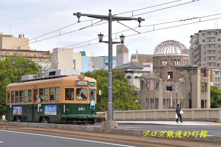 宮島の一歩手前で海沿いの景色を堪能したあとは、もう一度市内へ戻ってきました。いろいろな場所を転々として足も疲れており、このままホテルへ直行しようか、と思っていたのですが、電車に揺られているうちに少しは体力が回復したので、原爆ドーム前で下車し、もう少しだけ撮影を続けることにしました。 日は大きく西に傾き、低い雲の中に入ったため、昼間のような明るさはなくなりました。晴れていると逆サイドになり、車体側面は陰ってしまうので、むしろ、こちらの方がよいのかもしれません。 夕方のラッシュが近づいているのでしょう。電車が次々とやってきます。続行して来るため、前の編成が発車していくまで停留所の手前で一旦停止する後続車も出ている状況です。 原爆ドームがバックになる位置でカメラを構えます。路面電車撮影で一番気をもむのが自動車とのかぶりです。もちろん、この場所も信号グランプリで電車と車が並走してくる場面も多いのですが、比較的電車だけ、というシーンもあり、それほどイライラすることはありませんでした。ただ、場所柄、橋の欄干にたたずみ、原爆ドームを撮影する観光客が多く、車よりそちらの処理をどうするかで悩ませられました。まあ、仕方ないのですけれどね。 30分あまり撮影していると、単車(広電では、連接車でない車輛を「単車」と呼ぶようです)がやってきました。一度にたくさんの人数を運べるため、ラッシュ時には圧倒的に連接車が多い中で、単車の存在は貴重です。それも、やってきたのは351号車! 旧型車輛なら、もと京都市電の1900形でも十分と思っていたのが、それ以上に貴重な350形を原爆ドームバックで記録できるなんて! これで心おきなく撤収することができます。歩道に一人だけ歩行者が写り込みましたが、これぐらいはヨシとしましょう。さあ、ホテルに帰って一休みしたら、広島焼きだあ。 今日10月28日は、速記記念日(日本速記協会)、日本ABCデー、日中国交回復を記念し康康(カンカン)と蘭蘭(ランラン)が上野へ(公開後の1年間で入園者900万人突破、1972年)だそうです。鉄道コレクション 広島電鉄900形 912号[トミーテック]《発売済・在庫品》