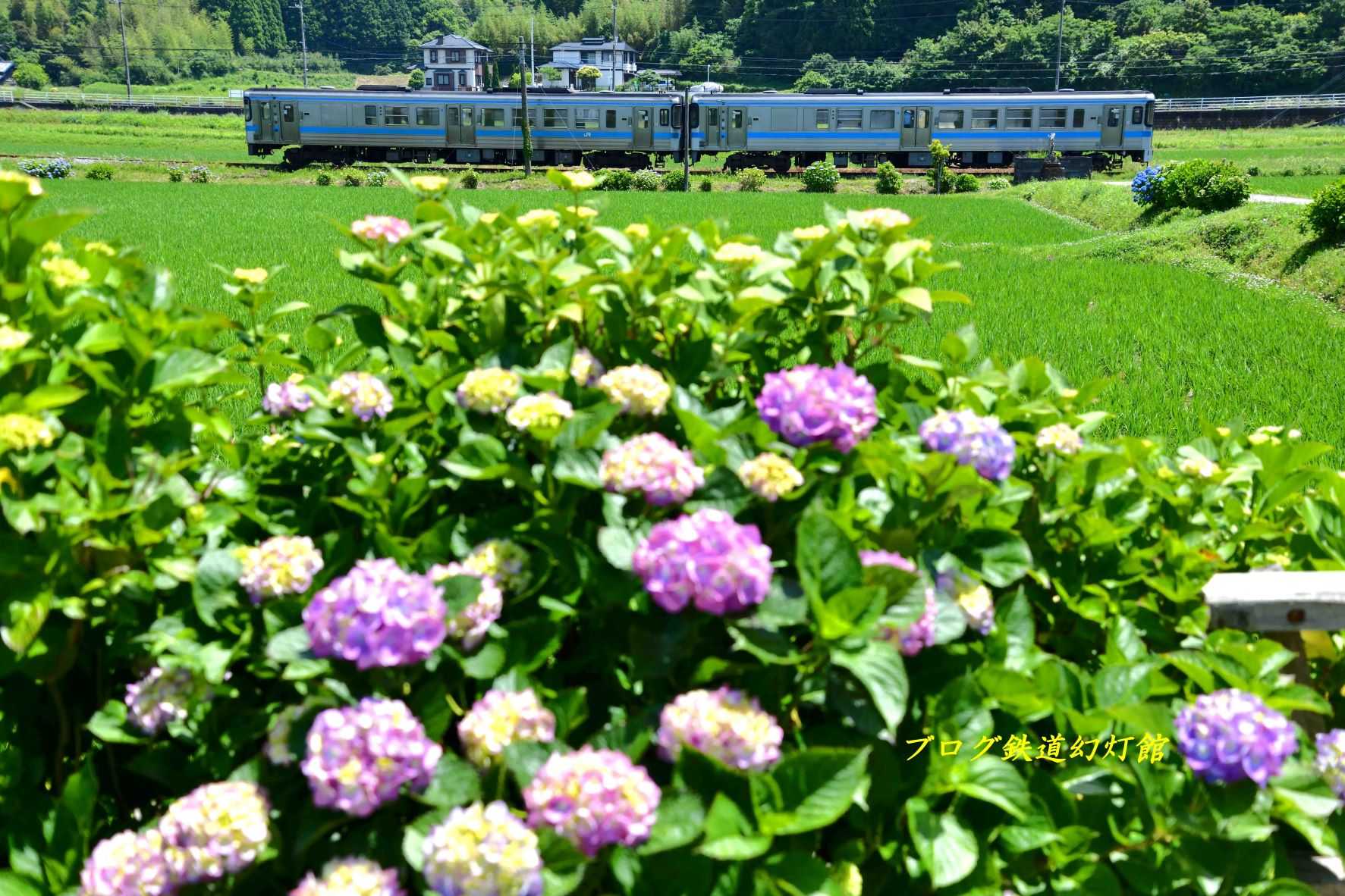 不動明王入りアングルを押さえたあとは、列車をサイドから撮る位置へと移動しました。 この場所は、線路際に一列、水田を挟んで一列、さらにもう一度水田を挟んで道路際にもう一列と、三列のアジサイを眺めることができます。 ただし、立ち位置によってはそれがうまく見えない所もあるため、立ったり座ったり、右に行ったり左に来たり、と場所を変えてアングルを探した結果、手前に大きくアジサイを入れたうえで、重なる列も取り込み、できるだけたくさんのアジサイが写るようにしてみました。 梅雨入り直前の晴れた日に、数少ない牟岐線の列車とアジサイを撮ることができてラッキーでした。 今日6月21日は、近畿日本鉄道で冷房特急の運転を開始(1957年)、がん支え合いの日、冷蔵庫の日、交番の日、スナックの日(全日本菓子協会)だそうです。