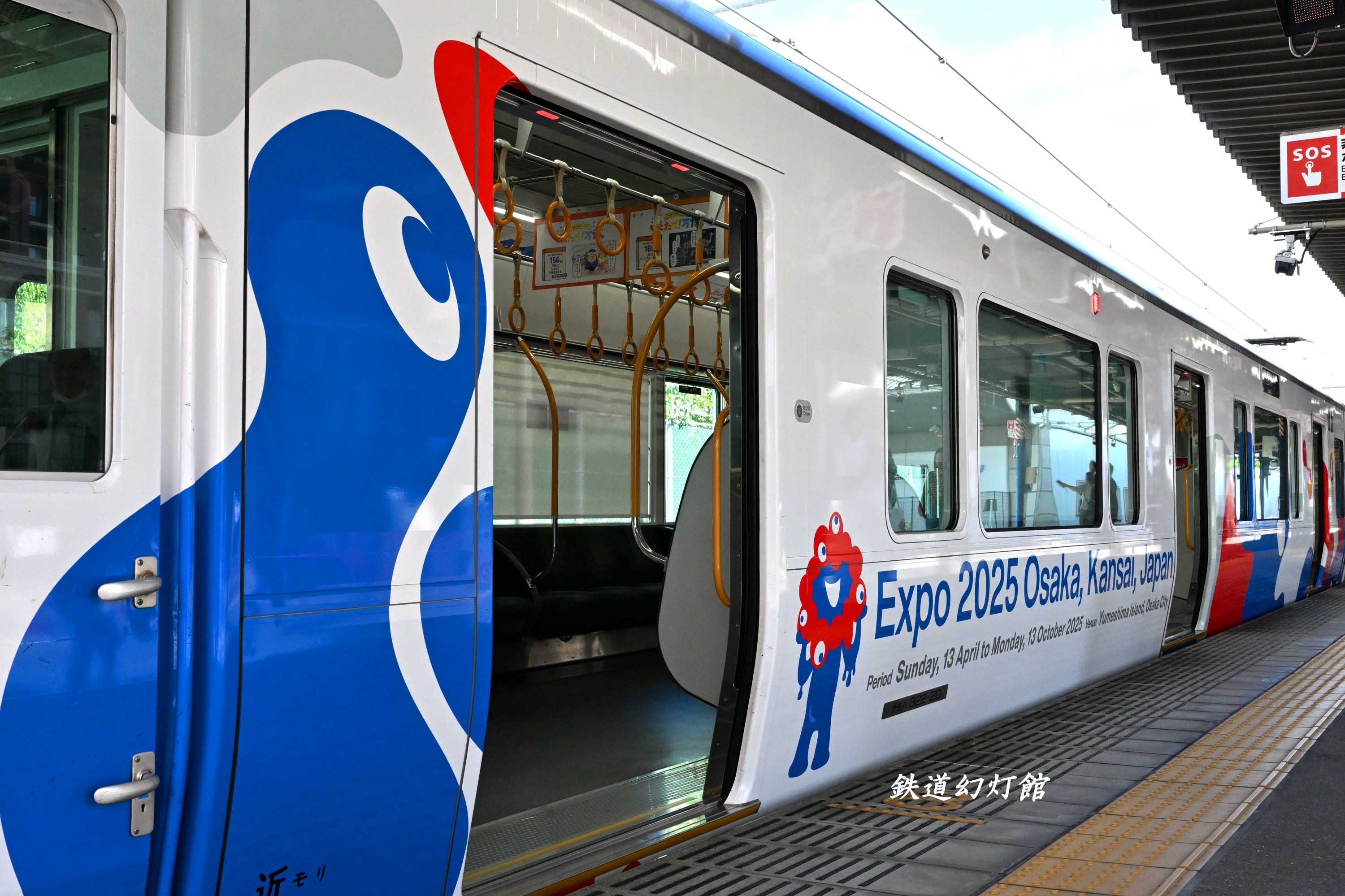 桜島駅周辺で撮影を済ませたのち、乗ろうとした列車がまさかの万博ラッピング車! 発車までの間に、側面や車内の様子を記録しました。
