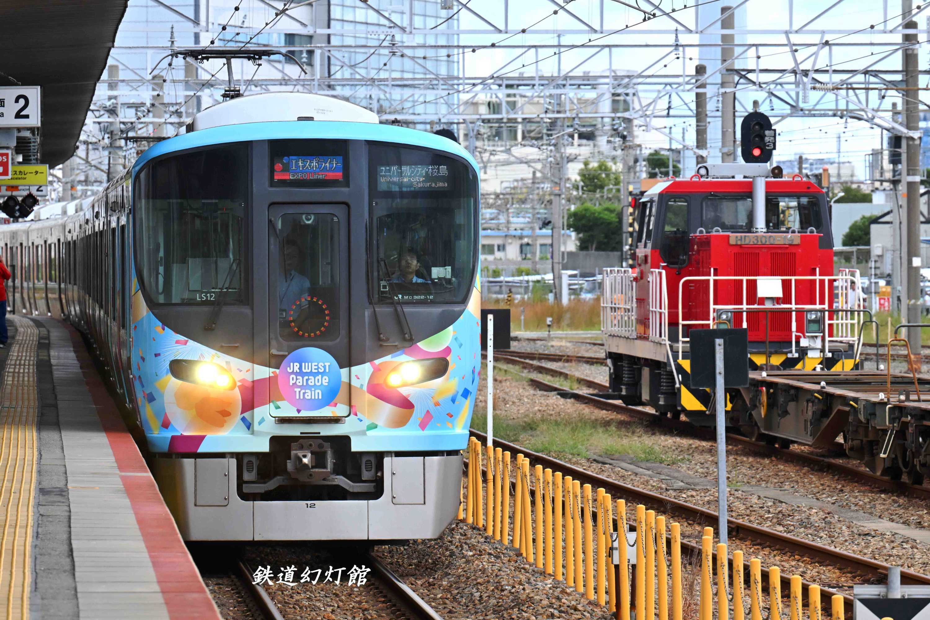 駅撮りの名所へ移動すると、わたくしと同じ考えのファンがすでに何人も待機中でした。閉幕日のこの日、万博ラッピング車は西九条駅と桜島駅の間を往復する運用についていたようで、それほど長い時間待つことなく編成写真を押さえることができたのはラッキーでした。