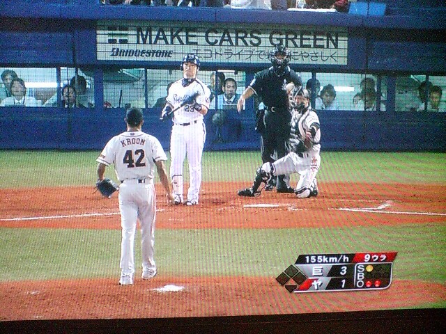 昨日の9回のクルーン劇場に続いて今日もクルーン劇場。しかも超強力な助っ人古城も加わりショートゴロをセカンドに放るとセカンドにいた古城が後ろへポロリと・・・本当なら1死1塁のはずを無死1・3塁へとハラハラ・ドキドキ劇場を演出。 引退後はドアラの巨人バージョン、痛いマスコットキャラへの転身がオススメ。、