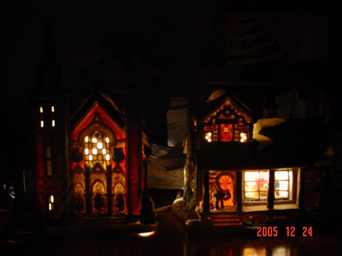 皆さんどんなクリスマスの夜をお過ごしですか?我が家は特別なイベントはなく、食事とお楽しみのケーキタイムです。今年は子供へのプレゼントを枕もとに置いてみました。何日も前から寝てる間にサンタさん来る?と何度も聞いていたのでようやく今朝それが現実になってプレゼントを見て嬉しそうに中の物を開けていました。でも以前からサンタさんから何が欲しいと聞くと必ずラムネ!と言っていたので、おもちゃと一緒にお菓子の詰め合わせを付けたのですがそれにはラムネが入っていなかったので、子供はラムネがない~と一言、私はすかさず他へ気を紛らわせました。笑以前買った陶器の家&ツリーをライトアップしてケーキを食べました。