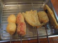 上野駅から御徒町へ向かう途中の「いこい」。ちょっと時間調節にも使える立ち飲み串揚げ店です。新幹線を待つ間に、一杯やりましょうか。レモンハイをいただきながら、食べ放題のキャベツをかじって、串揚げのあがるのを待ちます。北千住に「天七」、立石に「串揚げ100円ショップ」がありますが、仙台には無いのですよね・・・大阪に行けばたくさんあるソース二度付け禁止の立ち飲み串揚げ。せっかく東京に来たのだから、寄らなくっちゃ。(^▽^)<いつかえってくるの?月に1回は出張などで帰ってきますよ。候補日は10月は7日あたり。新潟行かないから。11月は18日あたりかな。芋煮会、今年もやりたいよね。 うずら、ウインナー、キス、牛サイコロステーキ、ナス。5本セットで600円。銀色の串揚げ用バットに「銀色の永遠」を感じたけど、心配なんていらない・・・