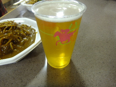 本日のランチは福島競馬場で。愛馬の応援後にほっと一息です。まずはお約束の昼ビールから。順位は2着。おつかれさまでした。会津若松で食べることができなかったカレー焼きそばがありましたのでオーダー。焼きそばに普通のカレーをかけただけのメニュー。カレーも焼きそばも大好きでメニューですので、美味しくないわけではないですが1+1が2以上になっているかというと残念ながら・・・でも福島競馬場のフードコートはさまざまなメニューがありますね。立ち食いですが、いろいろと楽しめました。どうもごちそうさまでした。「福三 福島競馬場店」福島県福島市松浪町9-23 福島競馬場 1F競馬開催日9:00~17:00福三 福島競馬場店 (焼きそば / 曽根田駅、福島駅)昼総合点★★★☆☆ 3.0