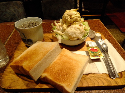 本日は東京ビックサイトでお仕事。銀座でモーニングのあとにバスで向かいましょう。ひさびさに喫茶「アメリカン」へ。佐賀っぽい店内が仕事を思い出させてくれます。ボリュームたっぷりのモーニングセット(600円)。ポテトサラダとマカロニサラダがてんこ盛りになっております。たっぷりのコーヒーと美味しいパンと共にいただくサラダな朝食。充実したところで仕事場へ向かいましょう。どうもごちそうさまでした!「喫茶アメリカン」東京都中央区銀座4丁目11-77:30〜18:30土日祝休
