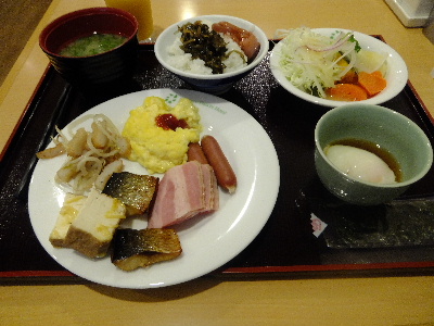 本日のモーニングは旭川「東横イン」にて。これから新千歳空港まで移動して、飛行機で東京へ帰ります。混みあう朝食会場。運悪くピークの時間にきてしまったみたいですね。平日サラリーマンですと回転が良いのですが、日曜日の朝はファミリーが多いようです。動物園ですかね。時間がないので玉子、ウインナー、ポテトサラダ、ブロッコリー。そしてお味噌汁を載せてモーニング完成です。ご飯は載らないので席が見つかってからですね・・・しばらく立っていても空きそうもなかったので、流しの前に立ちスペースがありました。そこでさくっと食べましょう。流しには数人のおばちゃん。荷物を別の場所にもっていったり、相席を促したりというお仕事はなくて、おしゃべりがメイン業務のようです。格好の獲物が見つかったようで「あら、この人立ってたべているわよ」「おばちゃんの顔を見ながらたべたいのでしょ」「きゃはは!」嘲笑されながらの朝食。年間の半分近くをホテルで暮らしておりますが、このような「サービス」は初でした。講演でのネタが出来たと自分を慰めましょう。アシスタントさんの手配通りに泊まってきましたが、こちらのホテルだけはなしでお願いしたいです。「東横INN 旭川駅東口 (イン)」北海道旭川市宮下通11-1176
