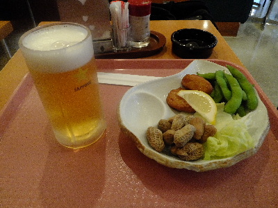 仕事が終わり、鹿児島中央からバスで鹿児島空港へ。少しだけ時間があきましたので、「フードコートウイング」で一杯やっていきましょう。ビールとおつまみのセットをお願いします。生ビール、落花生・枝豆・あつまあげのセット。ビールはサッポロですね。カウンターで注文して受け取り、空港の一階にあるフードコートで寂しくビール。居酒屋一人旅の真髄です。次回はドトールも併設されているので、ジャーマンドックとビールかな?どうもごちそうさまでした!「フードコートウイング 鹿児島空港店」鹿児島県霧島市溝辺町麓822 鹿児島空港ビル10:00~20:00フードコートウイング 鹿児島空港店 (ラーメン / 中福良駅、表木山駅、嘉例川駅)夜総合点★★★☆☆ 3.0