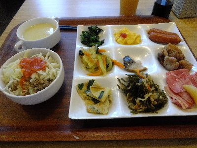 本日のモーニングは沖縄「「西鉄リゾートイン那覇」にて。バイキングスタイルの朝食です。ベーコン、スクランブルエッグ、ソーセージ、唐揚げ、焼魚、海草や野菜の煮物など。ご飯はセルフでタコライスを作ります。それにスープを添えて。どうもごちそうさまでした!「西鉄リゾートイン那覇」沖縄県那覇市久米2-3-13 西鉄リゾートイン那覇