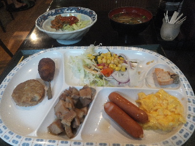 本日のモーニングは「ホテルラッソ 国際通り」にて。バイキングスタイルの朝食です。スクランブルエッグ、ソーセージ、ハンバーグ、煮物にサラダを盛りつけます。そしてご飯はタコライス、スープは沖縄そばにしました。地元の名物料理で始まる朝食は嬉しいですね。国際通りの便利な場所にあるホテル。居酒屋も近くて便利でした。どうもお世話になりました!「ホテルラッソ 国際通り (HOTEL RASSO)」沖縄県那覇市牧志1-3-43 ホテルラッソ 国際通り (その他 / 美栄橋駅、牧志駅、県庁前駅)昼総合点★★★☆☆ 3.0