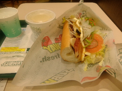 本日のトレーニングは夕方。トレーナーさんの都合で早い時間となりました。チェーン店しか営業してないお時間。ユアエルムの「サブウェイ」で小休止していきましょう。贅沢肉サンドをお願いします。「パンの種類は?」と聞かれます。ウイート、ホワイト、セサミ、ハニーオーツ?知らない横文字は軽くパニックになりますね。食パン6枚切り、8枚切りしか知らなかった昔。給食で胚芽パンを知ったかな?最近ふすまパンを覚えました。「すべておまかせで!」ようやく横文字から解放されました。肉というよりも野菜を感じさせる贅沢肉サンド。生ハム、ローストビーフ、ローストチキンが入っていますね。アルコールメニューはなく、コーンクリームチャウダーでいただきました。どうもごちそうさまでした!「サブウェイ」東京都葛飾区青戸3-36-1サブウェイ (サンドイッチ / 青砥駅、京成高砂駅) 昼総合点★★☆☆☆ 2.5