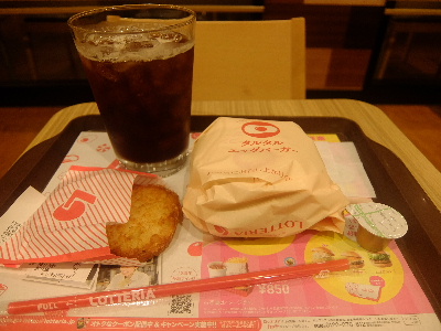 本日のモーニングは熊本「ロッテリア」にて。ホテルのチェックアウトタイム後、続きのお仕事をファーストフード店でさせていただきます。モーニングタイムですので、タルタルエッグバーガー、ハッシュポテト、アイスコーヒーで390円です。ハンバーグパティと半熟タマゴを合わせ、ケチャップ、ロッテリアオリジナルのタルタルソースをトッピングしたハンバーガー。なかなか美味しいですね。仕事を片付けたらウオーキングをしながら講演会場へと向かいましょう。どうもごちそうさまでした!「ロッテリア 熊本上通り店」熊本県熊本市中央区上通町6-237:30~22:30ロッテリア 熊本上通り店 (ハンバーガー / 通町筋駅、水道町駅、熊本城・市役所前駅) 昼総合点★★★☆☆ 3.0