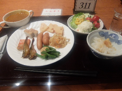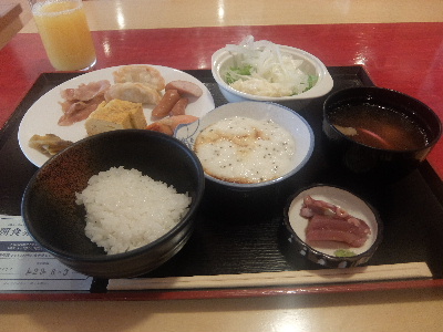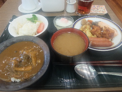本日のモーニングは大分「ホテル法華クラブ」にていただきます。バイキング形式の朝食です。なかなか充実したバイキングですね。鳥天、ベーコン、ソーセージ、筑前煮、焼魚。サラダはポテトサラダを添えてのタイプで。メインのご飯はカレー。温泉玉子とお味噌汁を添えて。普通のビジネスホテルですが、大浴場があり、繁華街も近く便利でよかったです。どうもお世話になりました!「ロータス」大分県大分市都町2-1-1ロータス (バイキング / 大分駅) 昼総合点★★★☆☆ 3.0