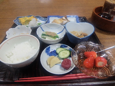 本日のモーニングは山形県酒田市「最上屋旅館」でいただきます。バイキング形式ではなく、一人前がテーブルにセットされておりました。焼魚に玉子焼き、煮物、納豆、お漬物。具沢山のお味噌汁は白味噌。デザートにイチゴが付いておりました。ご飯が美味しいですね。白いご飯を美味しく食べていただくシンプルですが美しい布陣。あまり炭水化物はとれないので、大切にいただきました。お部屋は急勾配の階段を登った3階にありました。4畳半の部屋が2つ。1つは座卓でお仕事、1つはお布団が敷いてある寝室。狭くても快適でしたね。お風呂が早仕舞いで朝風呂なしが残念でしたが、これも昔風ととらえましょう。どうもお世話になりました!「最上屋旅館」山形県酒田市中町2-2-16最上屋旅館 (旅館 / 酒田駅) 昼総合点★★★☆☆ 3.5