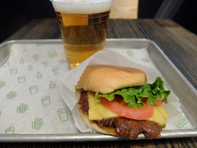 本日の居酒屋一人旅は恵比寿。老舗居酒屋にご挨拶の後は、少しお腹に入れてから次に行きましょう。駅前の「シェイク シャック」でエビスビールとシャックバーガーをお願いします。カウンターでオーダーしてから5分ほど立って待ってから席のあるほうへ。なんとか空いているテーブル席を見つけました。アルコールメニューはビールとワイン。オリジナルのビール、エビスビール、瓶でトウキョウブラック。ワインはナパバレーの1種類。ハンバーガーもいくつか種類のあるなかで、チーズバーガーをベースにレタス、トマト、シャックソースをトッピングしたシャックバーガーをお願いしました。肉肉しいお肉。アメリカを感じ出せるワイルドなお肉。パンは優しくソフトに。はにゃ、ふにゃ。はに丸くんを思い出しました。気軽に入れるファーストフードなお店。若いグループ、カップルが楽しそうに談笑しておりました。恵比寿らしい雰囲気ですね。さて、銀座へと向かいましょうか。どうもごちそうさまでした!「シェイク シャック アトレ恵比寿店 (SHAKE SHACK)」東京都渋谷区恵比寿南1-6-1 アトレ恵比寿西館 1F10:00~23:00(L.O.22:30)シェイク シャック アトレ恵比寿店 (ハンバーガー / 恵比寿駅、代官山駅、中目黒駅) 夜総合点★★★☆☆ 3.0