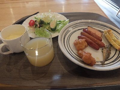 本日のモーニングは「宮崎第一ホテル」にていただきます。バイキング形式の朝食です。玉子焼き、焼き魚、唐揚げ、ウインナーをメインのお皿に盛り付けましょう。サラダはレタス、キュウリ、ミニトマト、わかめでいただきます。コーンスープとグレープフルーツジュースを添えて。駅から少し歩きますが、大浴場が嬉しいですね。露天風呂もあり、腰痛に優しく使わせていただきました。どうもお世話になりました!「宮崎第一ホテル」宮崎県宮崎市橘通東5-4-14 宮崎第一ホテル (旅館・オーベルジュ(その他) / 宮崎駅) 昼総合点★★★☆☆ 3.0