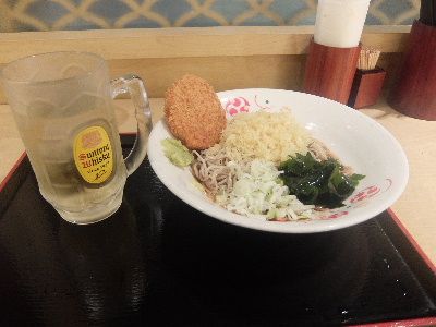 本日より居酒屋一人旅東北、北海道がスタート。まずは最初の目的地仙台へ向かいましょう。お盆ということで混みあう東京駅。すぐに入れた「いろり庵きらく」でランチ小休止と致しましょう。券売機でハイボール、冷やしたぬき、コロッケをぽちっとな。カウンターのおねえさんに券を渡して作ってもらい、セルフで席にもっていくスタイル。ハイボールは小さい缶をそのつど開封する安定品質。エビス小瓶と迷いましたが、糖質での判断です。冷やしタヌキとハイボールがトレーで渡され「おまたせしました」。衝撃が走ります。コロッケがない。。。でも券を渡したおねえさんは、休憩にでも入ったのか、その場にいません。コロッケを買った証明がないのです。小心者は泣くしかないのか?と思ったらおねえさん居ました。「ぼ、ぼ、ぼくのコロッケ」と勇気を出してリクエストです。幸運にも覚えていただいておりました。コロッケでハイボールを片付けて、冷やしたぬきをずるっといただきましょう。ワカメと天かすとネギのシンプル冷やしたぬき。山葵の味変で最後まで美味しくいただきました。どうもごちそうさまでした。「いろり庵きらく グランスタ丸の内店」東京都千代田区丸の内1-9-1 JR東日本東京駅 B1F[月~金] 7:00~22:30 [土・祝] 8:00~22:00 [日] 8:00~21:00いろり庵きらく グランスタ丸の内店 (そば(蕎麦) / 東京駅、大手町駅、二重橋前駅) 昼総合点★★☆☆☆ 2.0