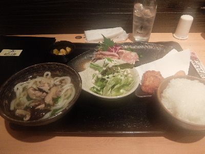 本日は霧島市でのお仕事。JR国分駅から少し歩きまして「鶏料理専門店みやま本舗」でランチといたします。カウンター席でお水をいただきます。スーツでの移動は汗だくになりますね。。。豊富なアルコールメニュー。ビール、ハインボール、サワー、ワイン、そして焼酎。残念ながらこれからお仕事。アルコールは我慢です。ランチメニューは唐揚げ、チキン南蛮、親子丼、チキンカツなど。刺身定食にしてみました。お水から6分ほどでマイターンです。お漬物・サラダ・鶏刺し3種盛り・チキンカツ・さつまあげ・白飯・地鶏そば。あれ、そばでなくてうどんですね。でも小心者は言い出せません。鳥刺しの鮮度は抜群。これで一杯やれないのが残念でなりませんでした。今度は夜にきて溶岩焼きをしてみたいですね。どうもごちそうさまでした!「鶏料理専門店みやま本舗 国分店」鹿児島県霧島市国分中央3-14-911:30~15:0017:30~23:30(LO23:00)鶏料理専門店みやま本舗 国分店 (居酒屋 / 国分駅) 昼総合点★★★☆☆ 3.0