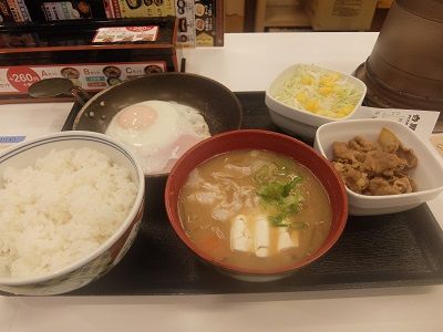 本日のモーニングは京成高砂「吉野家」さんでいただきます。塩サバや焼きシャケにも惹かれましたが、ハムエッグ牛小鉢でお願いしましょう。お味噌汁を豚汁チェンジにしてみました。まずはお水をいただき、お薬タイム。今日は忘れずにもってきました。吉呑みのアルコールメニューが目に入りますね。ビール、ホッピー、日本酒、焼酎、角ハイボール、レモンサワー、ウーロンハイ。いつか誰かとモーニングメニューで一杯やって朝帰りしてみたいですね。お水から2分ほどでマイターン。モーニングの到着です。ベジタブルファーストで野菜サラダから。血糖値をあげないようにゆったりといただきましょう。豚汁も具沢山で嬉しいですね。ハムエッグ、次いで牛皿をオンザライスしていただきます。しっかりとモーニングをいただき、食後のウオーキングへと向かいます。次回はアルコールメニューをいきたいですね。どうもごちそうさまでした!「吉野家京成高砂駅前店」東京都葛飾区高砂5-29-11吉野家 京成高砂駅前店 (牛丼 / 京成高砂駅、柴又駅) 昼総合点★★★☆☆ 3.0