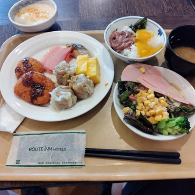 本日のモーニングは北海道千歳「ホテルルートイン」さんでいただきます。バイキング形式の朝食です。サラダはレタスを中心にブロッコリー、ワカメ、コーン、ハム。メインのお皿には焼売、コロッケ、玉子焼き、ベーコン、焼き魚。小皿にトロロ、御飯に塩辛、お漬物、お味噌汁。海苔は3枚です。美味しくいただきました。悲しいことがあって、深夜まで呑んでも、しっかりとお腹はすきます。本日はノーザンファームと社台スタリオンに寄って、静内へと向かいます。どうもごちそうさまでした。「花茶屋 ホテルルートイン千歳駅前」北海道千歳市千代田5-3-1 ホテルルートイン千歳駅前 1F花茶屋 ホテルルートイン千歳駅前 (ビュッフェ・バイキング / 千歳駅) 昼総合点★★★☆☆ 3.0