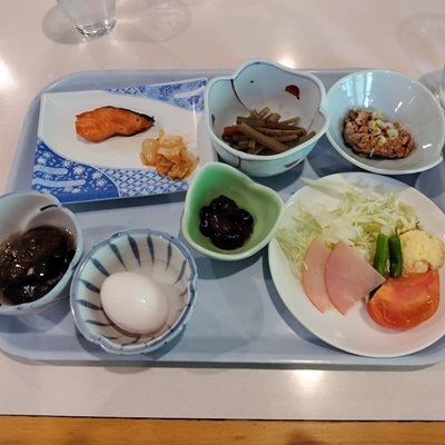 北海道静内で2泊のあとは、ばんけい温泉へ。豪雨と重なり、少し遅めの到着となりましたが、お風呂に入ってからの夕食で大丈夫でした。「湯人屋」さんの夕食はお野菜たっぷりの豚しゃぶ。朝湯に入ったあとの次の日のモーニングは和定食です。キャベツの千切り、トマト、ハム、ポテトサラダ。焼き魚、煮物、生玉子、納豆などでご飯を美味しくいただきました。こじんまりとした温泉宿。なかなかのお湯でしたね。お世話になりました。「湯人家」北海道有珠郡壮瞥町字蟠渓8-10湯人家 (旅館・民宿 / 伊達市その他) 昼総合点★★★☆☆ 3.0