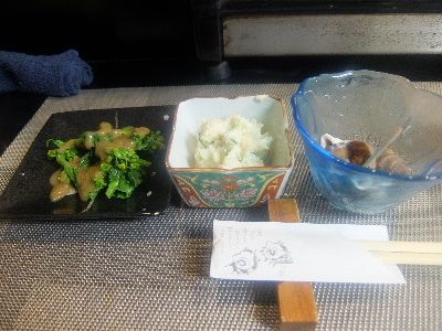 菜の花酢味噌、ポテトサラダ、貝の煮物。