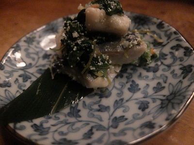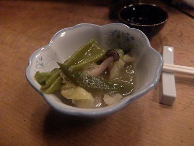 お通しの3点セットをいただきながら、ぼんやりとカウンターにて。