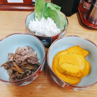 自家製ツナサラダ、牛肉しぐれ煮、コリンキーの浅漬けです。