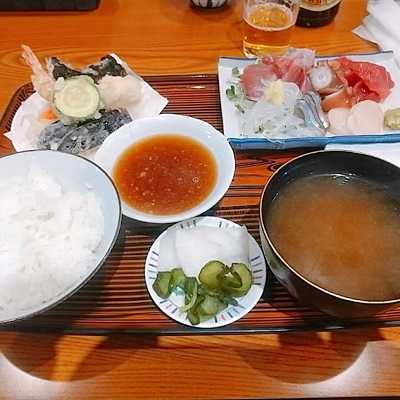 お刺身に加えて、天ぷら、お漬物、ご飯、お味噌汁のセットです。