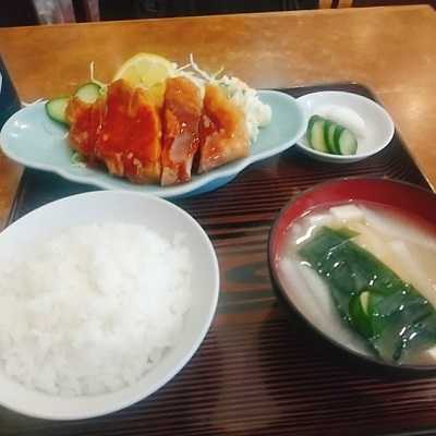 ポークソテーにお漬物、ご飯とお味噌汁です。